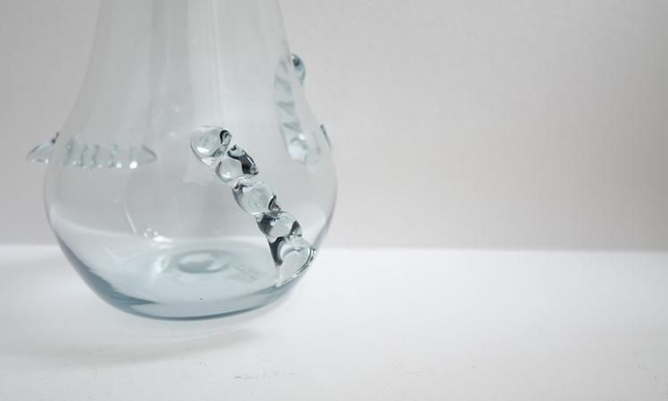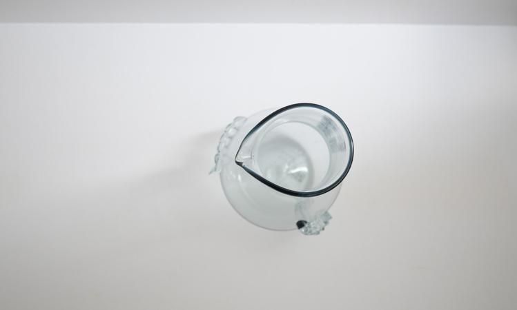 リメルトブルーのグラス。富山ガラス研究所では2024年より色ガラスの再生利用に取り組み始めました。学校で制作された様々な色ガラスを溶解炉に再投入してできる色合いです。ですのでその時々で色合いは多少違っています。