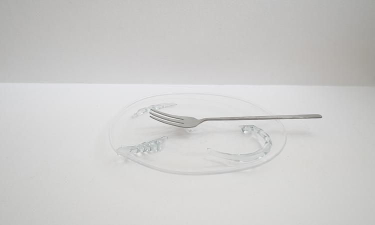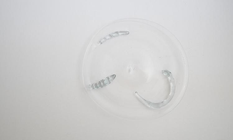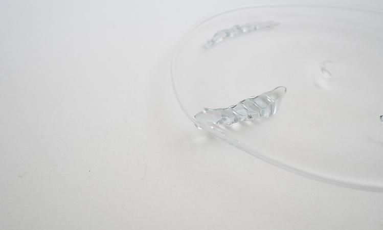 リメルトブルーのグラス。底についたビットが個性ある作品。ビット付きはどれも一点物です。富山ガラス研究所では2024年より色ガラスの再生利用に取り組み始めました。学校で制作された様々な色ガラスを溶解炉に再投入してできる色合いです。ですのでその時々で色合いは多少違っています。