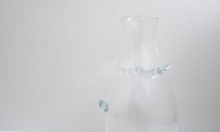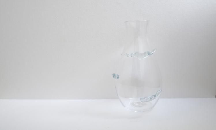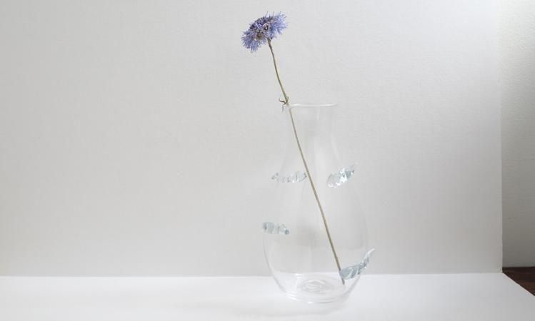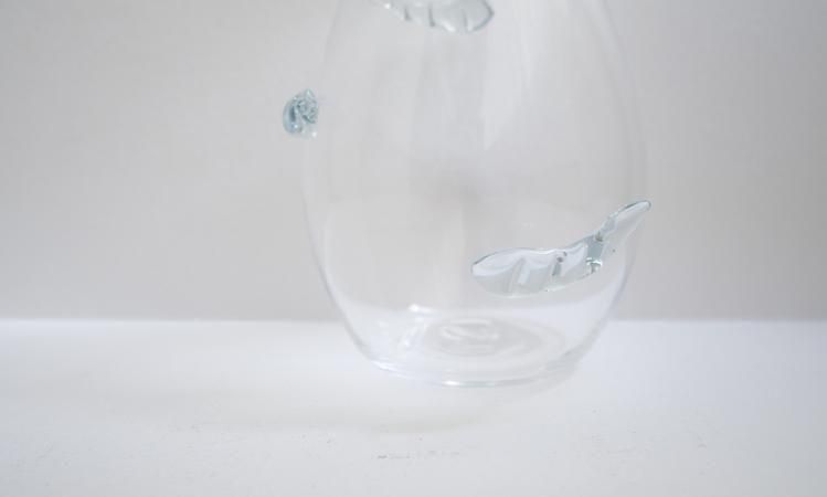 ニョロニョロ部分がリメルトブルー グラスです。富山ガラス研究所では2024年より色ガラスの再生利用に取り組み始めました。学校で制作された様々な色ガラスを溶解炉に再投入してできる色合いです。ですのでその時々で色合いは多少違っています。