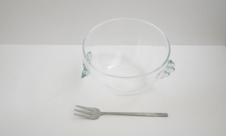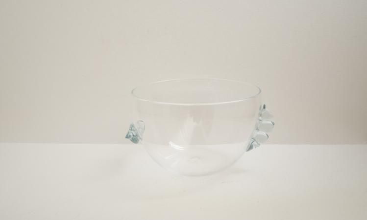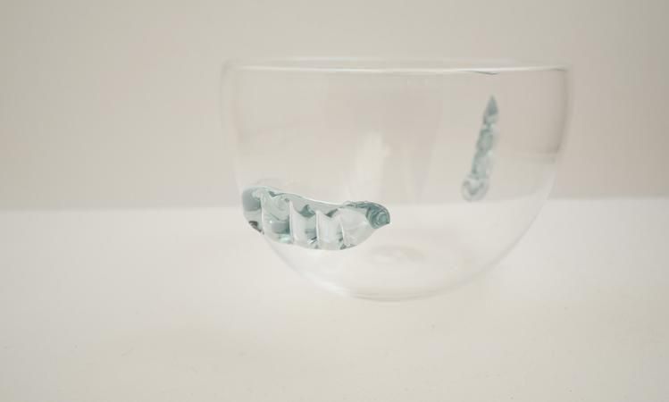 ニョロニョロ部分はリメルトブルー グラスです。富山ガラス研究所では2024年より色ガラスの再生利用に取り組み始めました。学校で制作された様々な色ガラスを溶解炉に再投入してできる色合いです。ですのでその時々で色合いは多少違っています。